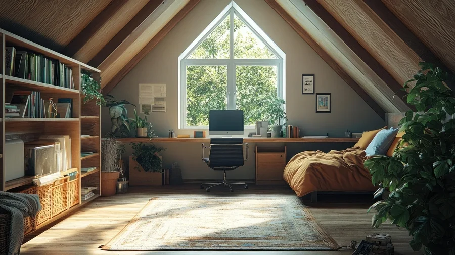 A cozy attic home office with a large window, wooden bookshelf filled with books, a desk with a computer, and a bed with yellow bedding.